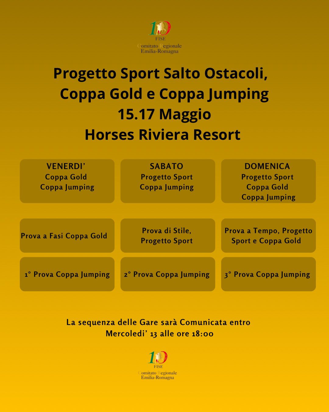 Il Comitato Regionale FISE Emilia-Romagna comunica una variazione della programmazione relativa alle prossime tappe del Progetto Sport Regionale, Coppa Gold e Coppa Jumping.