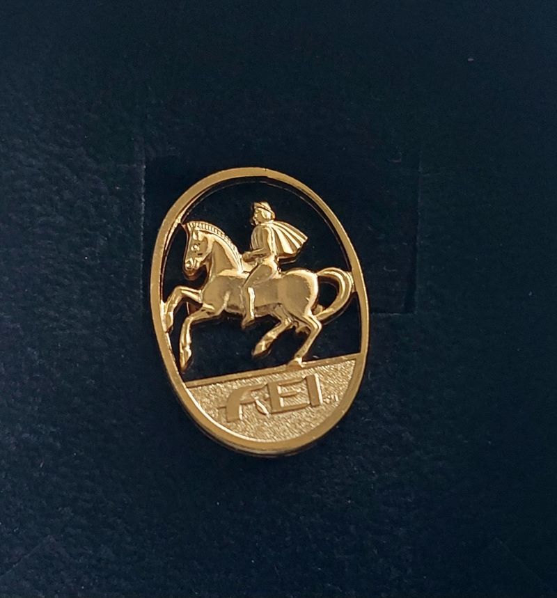 Nelle foto: © FEI/Leanjo de Koster: Sara Morganti insieme ad Alessandro Benedetti a Riesenbeck, sotto un dettaglio del FEI Gold Badge of Honour).